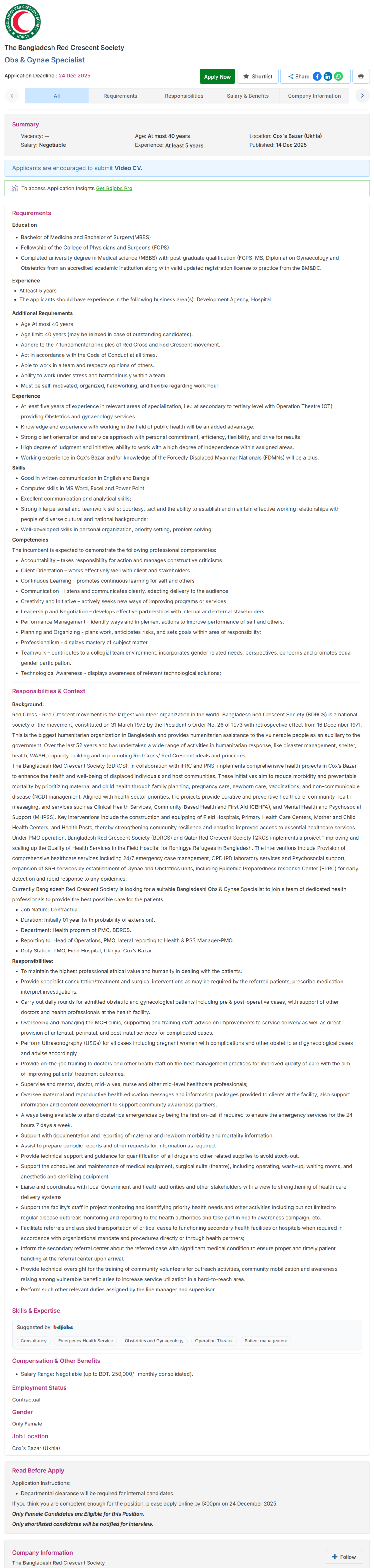 Bangladesh Red Crescent Society BDRCS Job Circular 2025: Red Cross-Red Crescent movement is the largest volunteer organization in the world. Bangladesh Red Crescent Society(BDRCS), a national society of the movement, constituted on 31 March 1973 by the President’s Order No.26 of 1973 with retrospective effect from 16 December 1971, is the biggest humanitarian organization in Bangladesh. As an auxiliary to the government, the Society provides humanitarian assistance to vulnerable people and over the last 47 years, has undertaken a wide range of activities in humanitarian response, disaster management, health, capacity building, and in promoting Red Cross/Red Crescent ideals and principles.